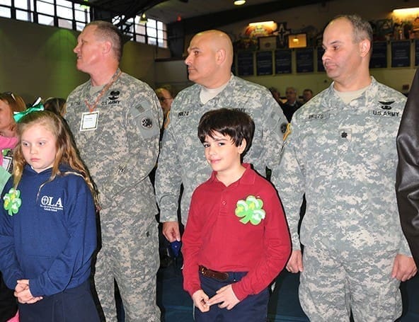 Active military dads from the parish and school community presented the American flag and led the Pledge of Allegiance, followed by the kindergarten students singing the national anthem.