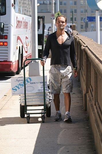 Rudy Schlosser, president of the Georgia State University Catholic Student Association, pulls a cart of food from the university down Central Avenue to the Shrine of the Immaculate Conception, Atlanta. Photo By Michael Alexander