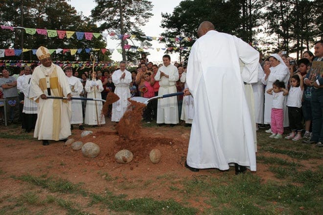 Archbishop Wilton D. Gregory, left, and Missionaries of St. Charles – Scalabrinians Father Jacques Fabre, right, administrator of San Felipe de Jesus Catholic Mission, turn over the dirt during the twilight groundbreaking at the Fulton County church. Photo By Michael Alexander
