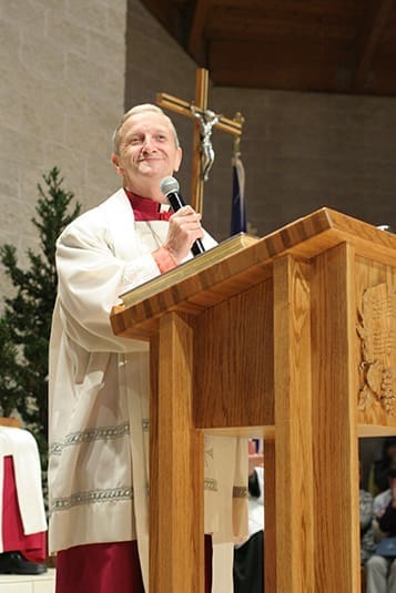 Msgr. Patrick Bishop, pastor of Transfiguration Church, Marietta, expresses his gratitude to all those who helped make the Family Life Center a reality. Photo By Michael Alexander
