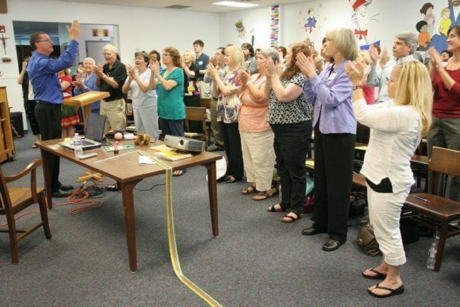 Lee Gwozdz, left, the director of music at the Corpus Christi Texas Cathedral ends his workshop session with a vocal/choral exercise that brought the room to its feet. Photo By Michael Alexander