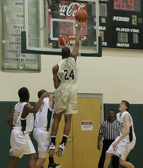 St. Pius X High School junior forward Ike Onyeka (#24) tips in two of his 18 points. Onyeka also had 10 rebounds to complete a double-double. Blessed Trinity won the Dec. 5 game 65-45. Photo By Michael Alexander