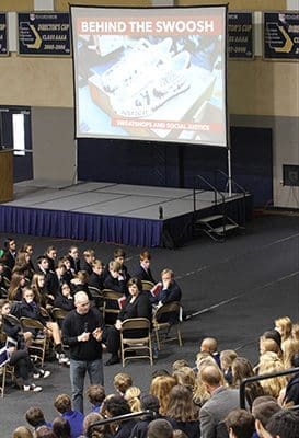 Educator and social activist Jim Keady, standing, bottom left, presents his talk, “Behind the Swoosh: Sweatshops and Social Justice,” to the high school student body at Marist School, Atlanta, in December 2014. Keady is also the founding director of Educating for Justice, Inc. Photo By Michael Alexander
