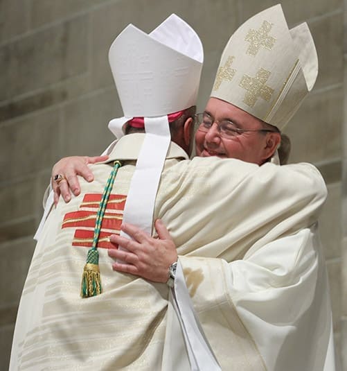 Bishop David Talley, right, receives the episcopal kiss of peace from the Archdiocese of AtlantaÕs first auxiliary bishop Luis Zarama. Photo By Michael Alexander