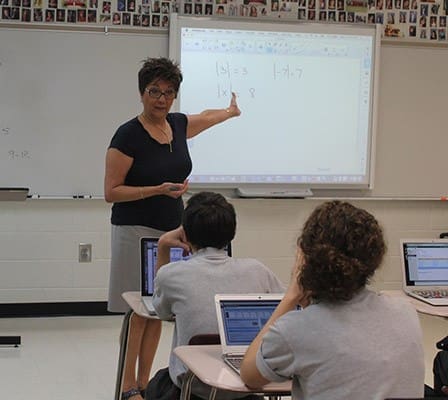 Ana DeMello, algebra and calculus teacher at Our Lady of Mercy High School in Fayetteville, stands before the interactive whiteboard in her classroom. The school recently became a 100 percent digital campus.
