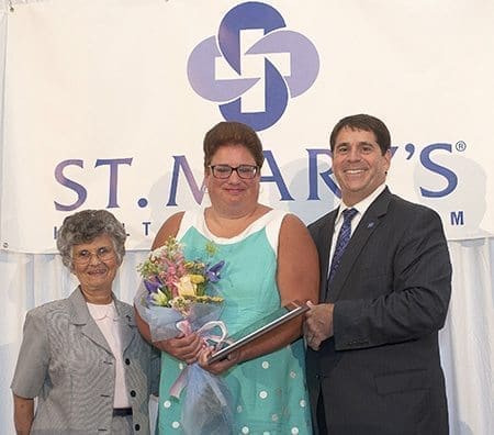 ATHENS—Debbie Boyle, an emergency department supply tech at St. Mary’s Hospital, Athens, received the highest award from St. Mary’s Healthcare System. Boyle was honored with the 2016 Catherine McAuley Award. The award, named in honor of the foundress of the Sisters of Mercy, was presented at the June 14 Tenure Banquet, honoring 278 employees for service of five to 40 years (in five-year increments).