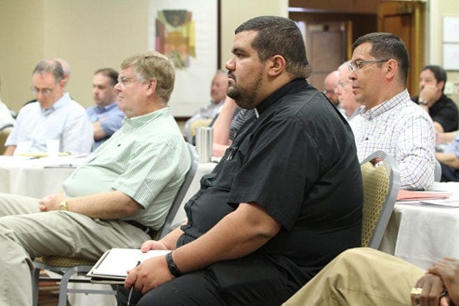 Father Luis Alvarez, center, parochial vicar at St. Theresa Church, Douglasville, listens to an afternoon presentation during the Atlanta Province Assembly of Bishops and Priests. In the background left is Father John Forbes, pastor of Our Lady of Lourdes Church, Raleigh, N.C., and in the background right is Father Javier Muñoz, parochial vicar at Immaculate Heart of Mary Church, Atlanta. Photo By Michael Alexander