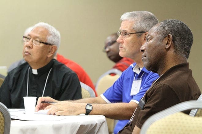 (Foreground, l-r) Father Arturo Dalupang, administrator of St. Ann Church, Kingtree, S.C., Father Robert Cushing, pastor of St. Joseph Church, Waycross, and Missionaries of St. Paul Father Charles Atuah, pastor of St. Benedict the Moor, Columbus are on hand for afternoon session of the Atlanta Province Assembly of Bishops and Priests. Photo By Michael Alexander