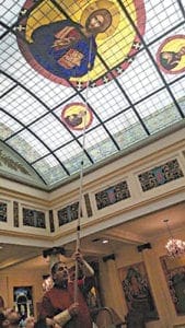 Sunday, Nov. 13, was the feast of the saint on the Byzantine calendar. During the service, Archimandrite John Azar recited the prayer for the blessing of icons. He dipped a brush in holy oil used in baptisms and mounted a wheeled ladder to anoint the recently commissioned Pantocrator icon of Christ in the church’s stained glass vaulted ceiling.