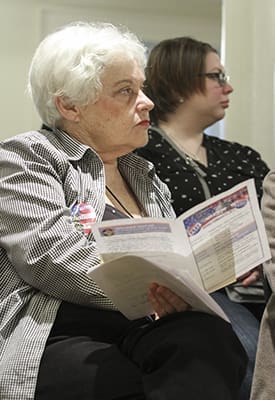 Nikki Vandergrinten, foreground, of Immaculate Heart of Mary Church, Atlanta, and Michelle Dukes, background, of St. Stephen the Martyr Church, Lilburn, participate in the legislative briefing for the Feb. 21 Catholic Day at the Capitol. Photo By Michael Alexander