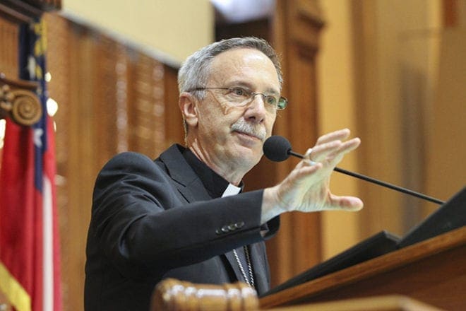 Bishop Zarama served as chaplain of the day for the Georgia House, providing remarks before praying with representatives. Catholic Day participants took seats in the gallery above chambers for a bird’s eye view.