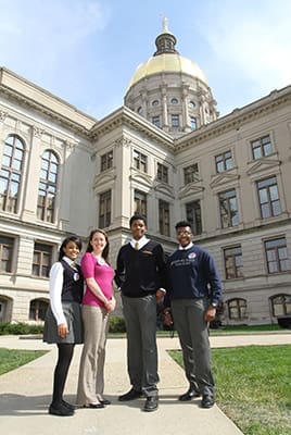 Cristo Rey Atlanta Jesuit High School religion instructor and campus minister Bernadette O’Neill, second from left, accompanied Cristo Rey Atlanta students (l-r) Monica Epps, Malcolm Delfish and Jahari Fraser to the 2017 Catholic Day at the Capitol. Photo By Michael Alexander