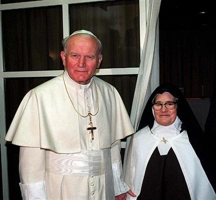 Pope John Paul II is pictured with Carmelite Sister Lucia dos Santos, the last of the three Fatima visionaries alive in 1991. Recent popes have had a special affection for Our Lady of Fatima, but no pope’s connection can match that of now St. John Paul II. CNS photo/Joao Paul Trindade via EPA