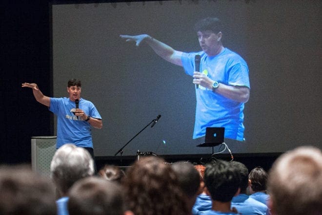 Speaker Doug Tooke, of Monarch Catholic Ministries, speaks on the importance of looking to the saints for inspiration to the 300 youth who attended the middle school track at the 2017 Eucharistic Congress. The track for this age group debuted June 17. Photo by Thomas Spink