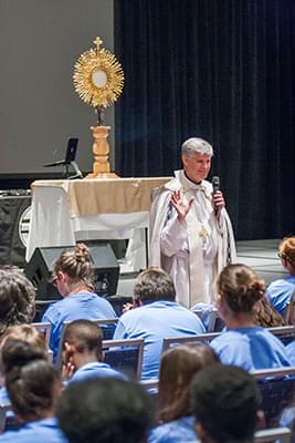 Bishop-designate Bernard E. “Ned” Shlesinger III, participating in his first Eucharistic Congress in Atlanta, visits the middle school track at the event. He brought the monstrance to the track for Eucharistic adoration and answered a number of questions from the students. Photo by Thomas Spink