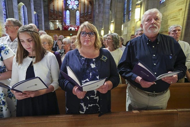 The relatives of Bishop-designate Joel M. Konzen, SM, (front pew, r-l), including his brother Raymond, his niece and Raymond’s daughter, Terese Struble, and Terese’s daughter, Riley, join a host of other relatives and friends for the April 2 vespers service at the Cathedral of Christ the King, Atlanta. Photo By Michael Alexander
