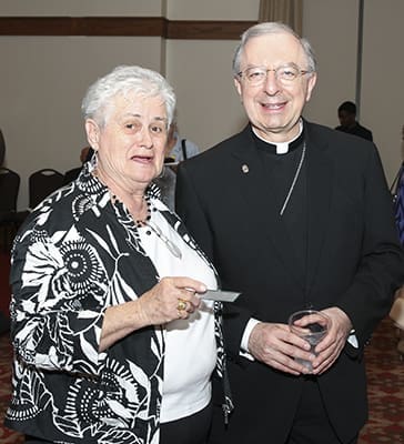 During the reception that followed the solemn vespers service, Bishop-designate Joel M. Konzen, SM, poses for photo with his cousin from Wisconsin, Joanne Thome. Photo By Michael Alexander