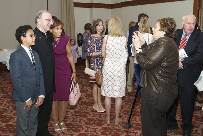 Rosemary Stein of Greenville, S.C., second from right, photographs Christa Singleton and her 12-year-old son, Matthew, with Bishop-designate Joel M. Konzen, SM, during the post-vespers reception. Three of Stein’s sons attended Marist School when Konzen was the principal. Singleton is a 1983 graduate of Marist and Matthew will be attending at the start of the 2018-2019 school year. Photo By Michael Alexander