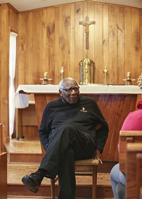 Prior to a Wednesday morning prayer service, Deacon Alfred Mitchell converses with a parishioner in the chapel at Sts. Peter and Paul Church, Decatur. Deacon Mitchell has been a deacon for 31 years. Photo By Michael Alexander