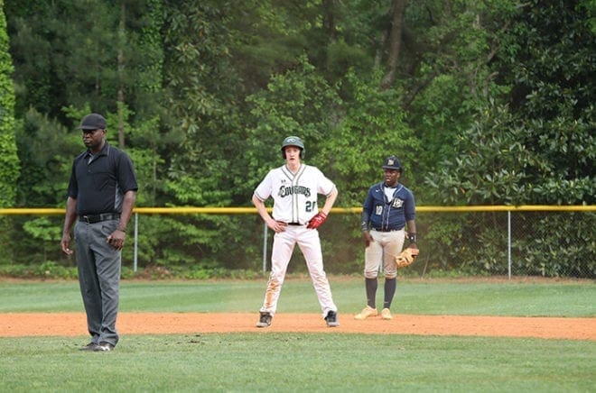 Holy Spirit Prep third baseman Palmer Pressly (#20) takes a lead off second base. He had one of the team’s six hits in the fourth inning. They defeated Atlanta’s Brandon Hall School 13-3 in the April 25 game. Photo By Michael Alexander