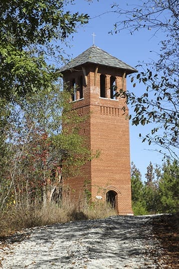 A gravel road leads up to the Martin Gatins Chapel, a cedar-framed structure, with a brick bell tower, in the Hill Top section of Honey Creek Woodlands, Conyers. The chapel, which opened in 2016, was made possible through the late Martin Gatins’ generous donations to the Monastery of the Holy Spirit. Photo By Michael Alexander