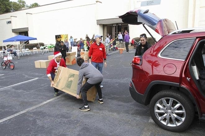 Hundreds of volunteers were divided between six locations to deliver gifts Dec. 7 from Cedartown to Forest Park. One of the locations was the new Catholic Charities warehouse in Doraville, which included a Santa Claus visit and activities for kids.