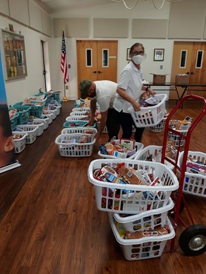Rich and Missy McPhee prepare baskets of food at the drive-in pantry event April 18 at St. Mary of God Church, Jackson, sponsored by the SVdP conference to assist 60 families in need.