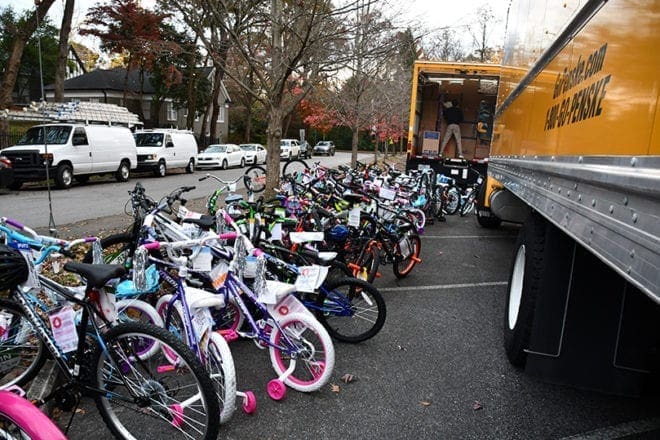 While more than 50 new bikes were donated to Christmas Connections at the Cathedral of Christ the King drop-off location Dec. 3, numerous requests for necessary items such as baby wipes, diapers and clothing were also generously fulfilled. The program supports families served through Catholic Charities in Atlanta and Cedartown. Photo by Jackie Holcombe