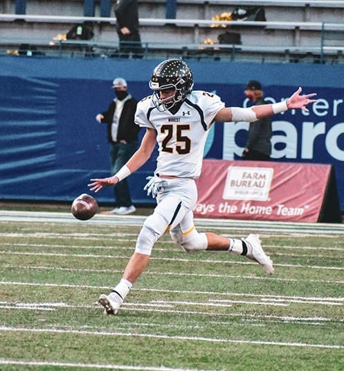 Marist School’s Charlie Fleming kicks one of the team’s five punts during the Class 4A state football championship game. Fleming averaged 46.4 yards per punt in the Dec. 29 gridiron event. Fleming, who also plays defensive back, had three solo tackles. One of the tackles resulted in a two-point safety during the third quarter. Marist went on to defeat Jefferson High School 30-14 and Fleming was named the game’s most valuable player. Photo By Maddy Djuric/Marist Class of 2021