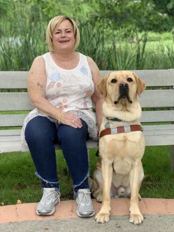 Joanne Callahan and her guide dog, Magnum, enjoy time outdoors. Callahan, a parishioner of St. Brendan the Navigator Church, Cumming, finds the resources of the Xavier Society for the Blind a boost to her spiritual life. Photo Courtesy of Guiding Eyes for the Blind
