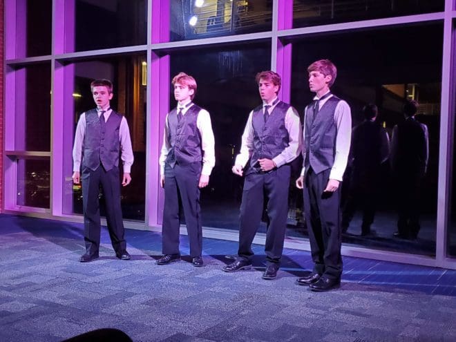 From left to right, Brennan Ujda, John Monnin, Drew Avitabile and Brent Porter present an a capella version of “Stand By Me” at the Marist Senior High Fall Choral Concert. Photo by Samantha Smith