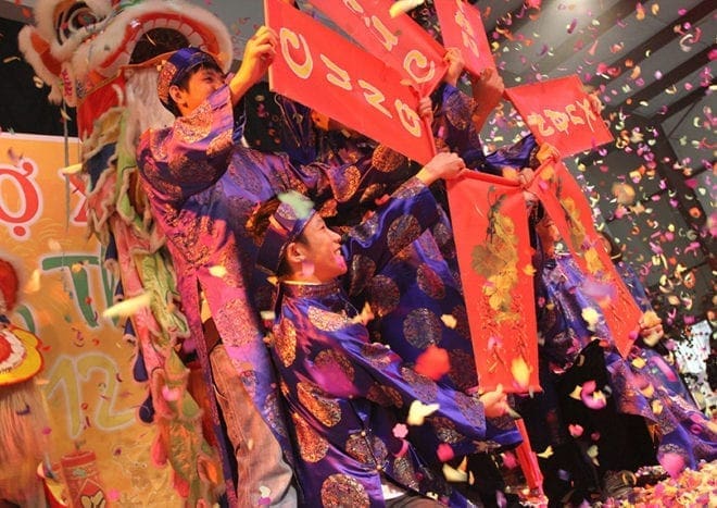 Wearing the traditional long dress and hat for men, known in the Vietnamese culture as an Ao Dai Khan Dong, the young men hold up a sign that says “Happy New Year” as confetti fills the air. Photo By Michael Alexander