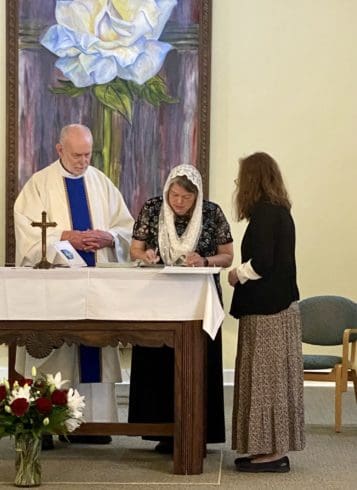 Heather Triggs, center, signs her vows of consecrated life, after professing them at a Connecticut retreat center. She initially professed the vows of chastity, obedience and poverty in November. Atlanta friends later attended a Mass of Thanksgiving where she renewed the vows.
