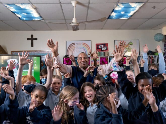 Yemane Ghidey, a native of Eritrea in East Africa, is the beloved school facilities manager at St. Thomas More School, Decatur. He shares a joyful moment with the third-grade students of teacher Beth Todd. Photo by Johnathon Kelso