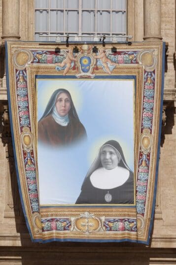 New saints are seen on a banner on the facade of St. Peter’s Basilica before Pope Francis’ celebration of Mass for the canonization of 10 new saints in St. Peter’s Square at the Vatican. Pictured are St. Carolina Santocanale, Italian founder of the Congregation of the Capuchin Sisters of the Immaculate of Lourdes, and St. Maria Domenica Mantovani, co-founder and first superior general of the Little Sisters of the Holy Family. CNS photo/Paul Haring