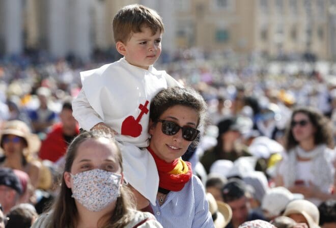 A child sits on the shoulders of a woman as people wait for the start of Pope Francis’ celebration of Mass for the canonization of 10 new saints in St. Peter’s Square at the Vatican May 15. Five of the new saints are from Italy, three from France, one from India and one from the Netherlands. CNS photo/Paul Haring