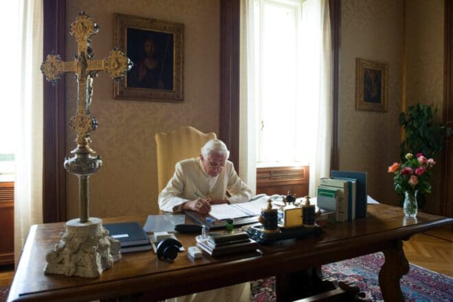 Pope Benedict XVI is pictured at his desk in the papal residence at Castel Gandolfo, Italy, in this 2010 photo. CNS photo/Vatican Media