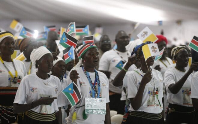 The new South Sudan will be built by “you, from all your different ethnic groups, you who have suffered and are still suffering, you who do not want to respond to evil with more evil,” the pope told them during a meeting Feb. 4 at Juba’s Freedom Hall.