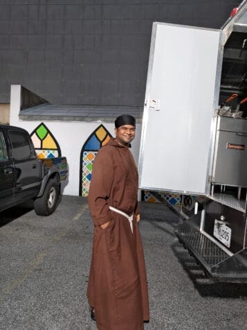 Capuchin Franciscan Praveen Turaka arrives for food prep at his order’s food truck at the Shrine of the Immaculate Conception. Photo by Johnathon Kelso