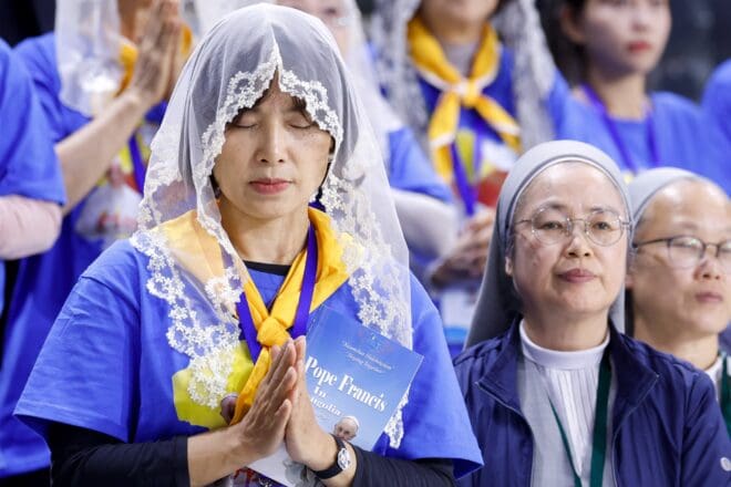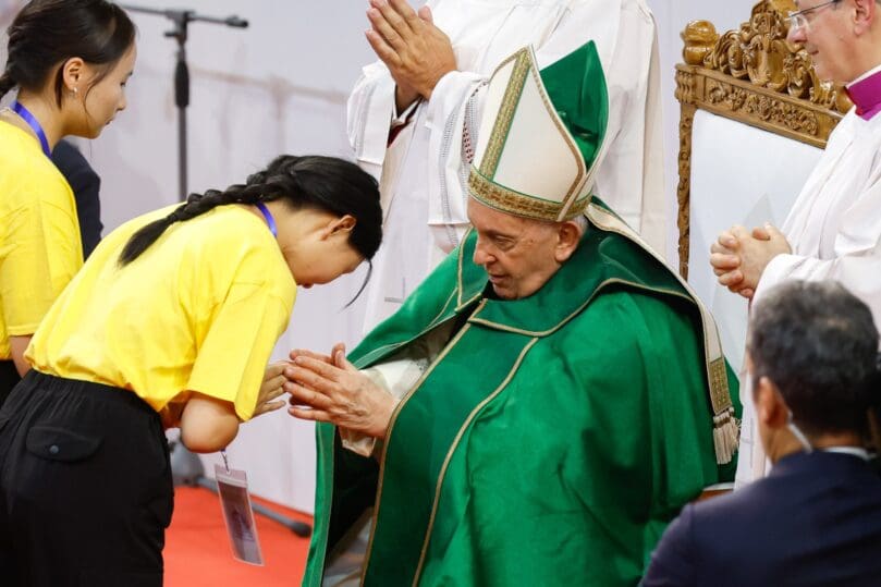 Bishops and pilgrims also came from South Korean and Vietnam, including a dance troupe that performed for the crowd that gathered hours before Mass. When the pope arrived, the Vietnamese dancers rushed to the crowd barriers, waving their conical straw nón lá hats.