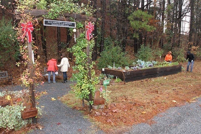(L-r) Christ Child Society volunteers (l-r) Kathy Thompson of the Cathedral of Christ the King, Atlanta, Mimi Dukes of St. Jude the Apostle Church, Sandy Springs, Maria Barton of All Saints Church, Dunwoody, and Shelia Moriarty of St. Jude the Apostle Church perform their monthly winter maintenance in the garden on the grounds of the Elaine Clark Center for Exceptional Children, Chamblee. The garden is named after the late Elizabeth Hoffman, a former president of the Christ Child Society. Photo By Michael Alexander