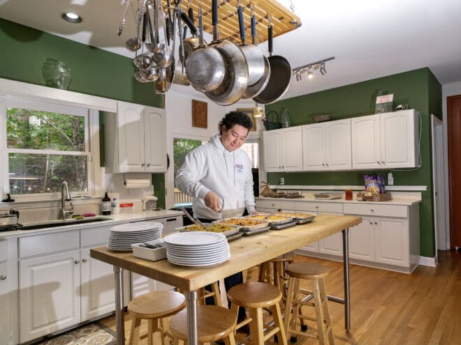 The center, a 10-minute walk from the heart of the campus, has seen a surge of students. The young adults come to the converted three-bedroom ranch house four days a week for the no-cost lunch. The abundance of mouths to feed pushes the volunteer chefs to fill more plates.