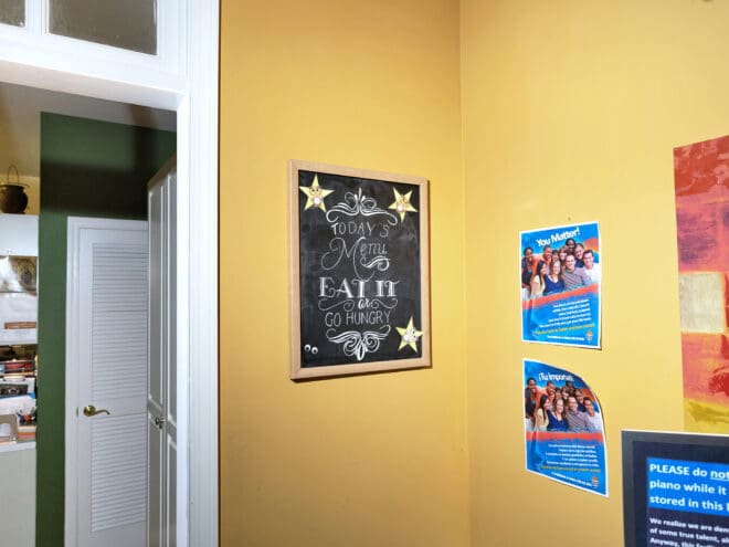 A chalkboard message inside the Catholic Center at KSU urges visitors to eat. Photo by Johnathon Kelso