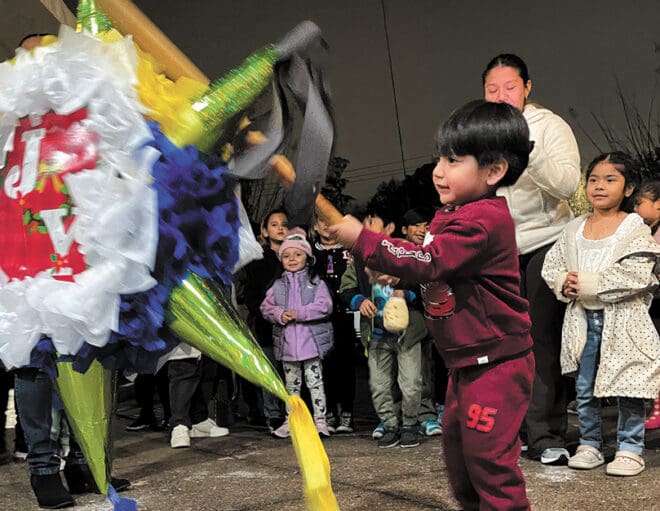 A youngster at Immaculate Heart of Mary Church, Brookhaven, whacks a pinata to get at the candy tucked inside. The pinata is part of the Posada celebration fun for families. Photo by Andrew Nelson