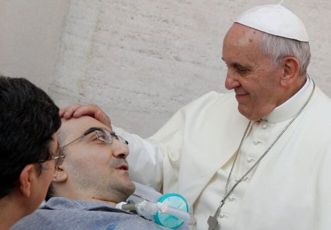 Pope Francis greets Salvatore D’Argento of Chieti, Italy, as he arrives to lead his general audience in St. Peter’s Square at the Vatican in 2014. D’Argento has quadriplegia. CNS Photo/Paul Haring