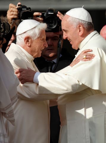 Pope Francis greets emeritus Pope Benedict XVI during an encounter for elderly in St. Peter’s Square at Vatican Pope Francis greets emeritus Pope Benedict XVI during an encounter for the elderly in St. Peter’s Square at the Vatican Sept. 28, 2014. CNS photo/Paul Haring