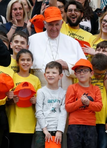 Pope Francis wears a hat as he poses for a photo with children during his general audience in St. Peter’s Square at the Vatican May 22, 2019. CNS photo/Paul Haring