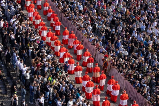 More than 80 cardinals joined the procession ahead of Cardinal Farrell, who was wearing a red and gold cope, and immediately preceded the pallbearers flanked by members of the Pontifical Swiss Guard.