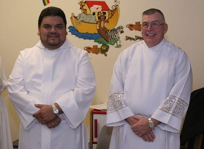 Permanent diaconate ordination candidates Jose Trinidad Merlo-Quintero, left and Norm Keller gather in the Cathedral of Christ King nursery with the other 14 candidates prior to their Feb. 5 ordination. Photo By Michael Alexander