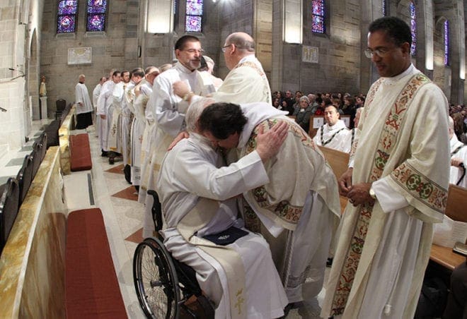 Deacon John Strachan of St. Thomas Aquinas Church, Alpharetta, in wheelchair, offers the Kiss of Peace to Scott Medine of St. Joseph Church, Athens. Deacon Leonard P. Chambliss, Jr., right, of St. Philip Benizi Church, Jonesboro, waits in the foreground. Photo By Michael Alexander